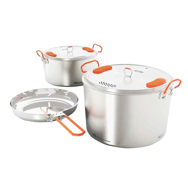 Glacier Stainless Base Camper Large er et robust sett i rustfritt stål. Inneholder: to store kjeler (3 l og 5 l) i rustfritt stål, to lokk med sil, stekepanne og praktisk transportpose. Stekepanne og lokk er også i rustfritt stål. Silikonpads på lokket der tomlene holdes når du heller ut vann, samt på håndtak på både lokk, kjele og stekepanne.