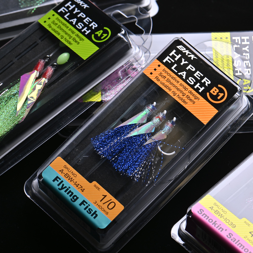 The series Hyper Flash B1 features BKKs Glow Heavy Circle. Each hook carries shimmering fibres to boost the presentation of the rig. Choose between several different colour combinations.
