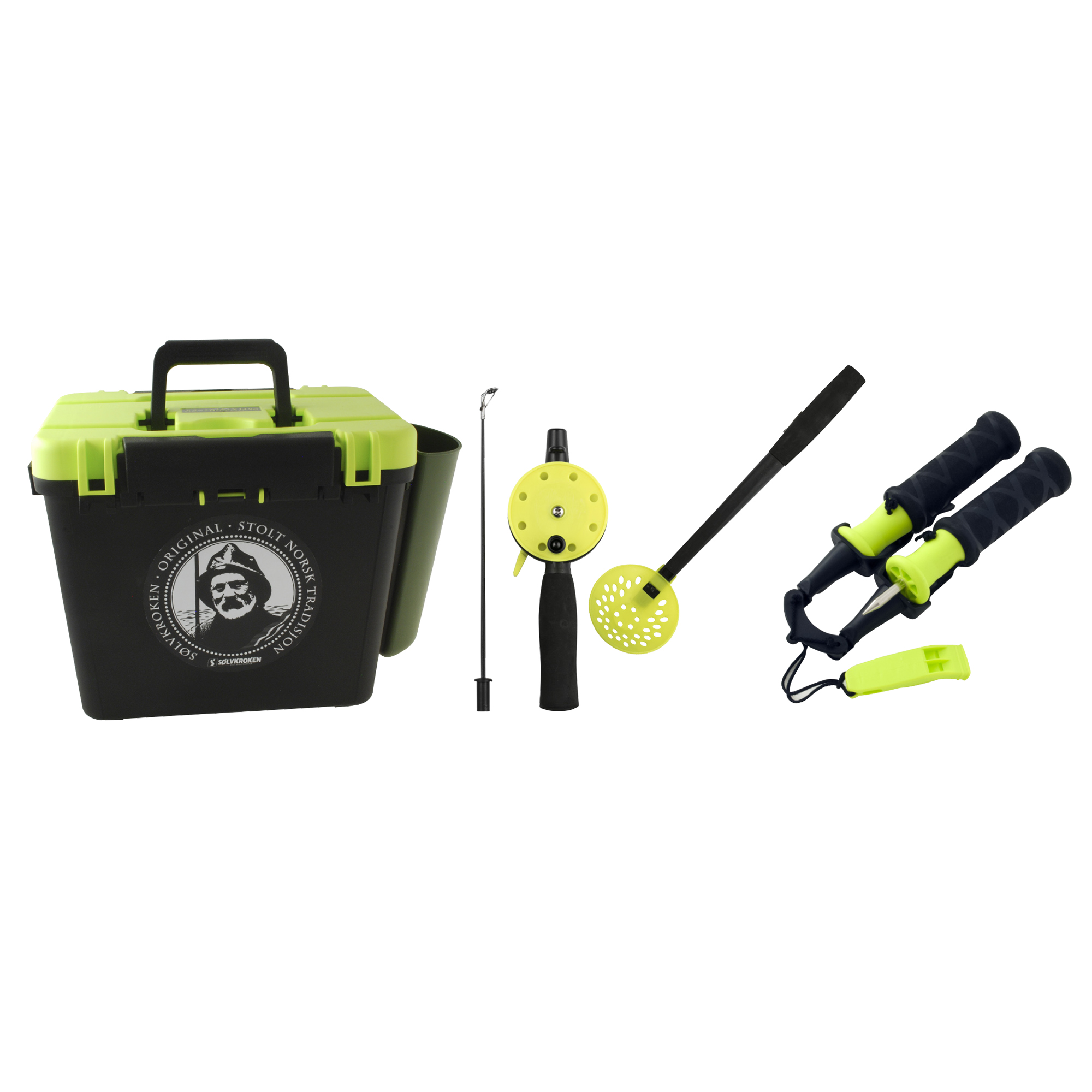 Solid isfiskedunk med mange praktiske rom til å oppbevare utstyr og fangst i. Her følger det også med ispigger, pilkesett med røyeblink og isøse.